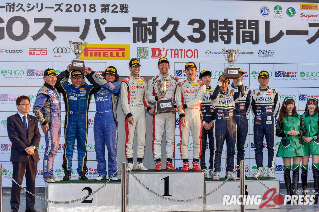 4月28日(土)、宮城県のスポーツランドSUGOで「ピレリスーパー耐久シリーズ2018 第2戦」のGr.2決勝レースが3時間で行なわれ、ST-4クラスは#86 TOM’S SPIRIT 86(松井孝允/坪井翔/中⼭雄⼀)が貫禄のポール・トゥ・ウィン。ST-5クラスは7番手スタートの#67 YAMATO FIT(安井亮平/池⽥歩)が、2度のセーフティーカー導入を上手く利用し優勝した。