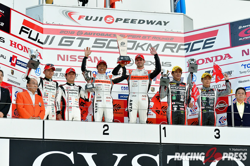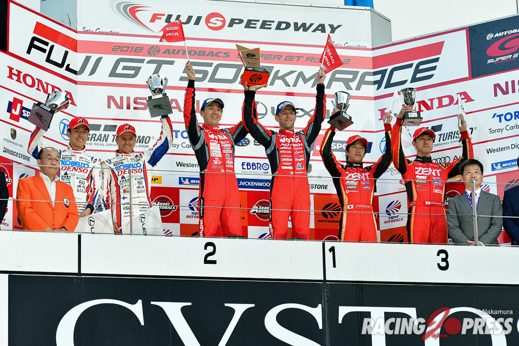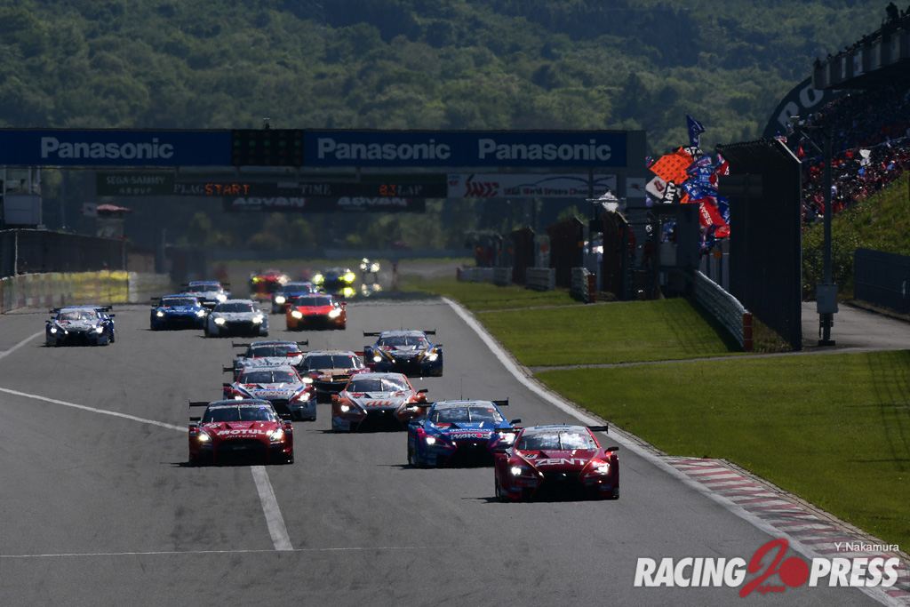 5月4日(金)、冷たい強風が吹くものの、見事な五月晴れに恵まれた富士スピードウェイで、SUPER GT 第2戦の決勝が500km・110周で行われ、GT500クラスは3番グリッドからスタートした#23 MOTUL AUTECH GT-R(松田 次生/ロニー・クインタレッリ)が1周目でトップに躍り出た後、盤石のレース運びで優勝した。2位には#39 DENSO KOBELCO SARD LC500(ヘイキ・コバライネン/坪井 翔)が入り、WECに参戦した小林 可夢偉の代役に抜擢された坪井 翔が存在感を見せつけた。ポールポジションからスタートした#38 ZENT CERUMO LC500(立川 祐路/石浦 宏明)は、#6 WAKO’S 4CR LC500(大嶋 和也/フェリックス・ローゼンクヴィスト)とのバトルを制し、3位表彰台をもぎ取った。
