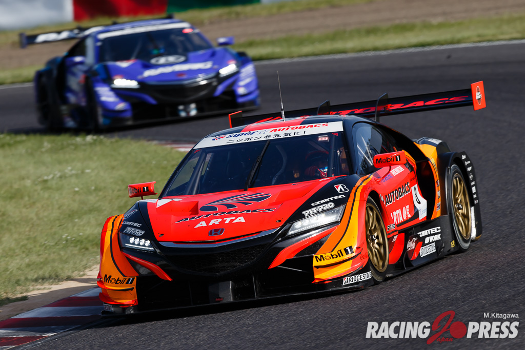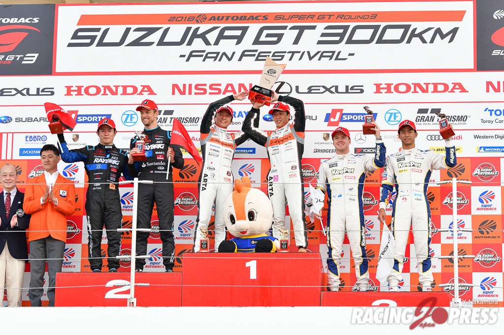 5月20日(日)、鈴鹿サーキットで「SUPER GT Rnd3」の決勝が行われた。ウォームアップ開始直前に、計時機器の不具合で進行がストップ。その後約40分遅れの15時28分にスタートが切られた。GT500クラスは#8 ARTA NSX-GT(野尻 智紀/伊沢 拓也) がポール・トゥ・ウィンで完勝。2位に#100 RAYBRIG NSX-GT(山本 尚貴/ジェンソン・バトン)、4番グリッドからスタートした#1 KeePer TOM’S LC500(平川 亮/ニック・キャシディ) が3位に入った。