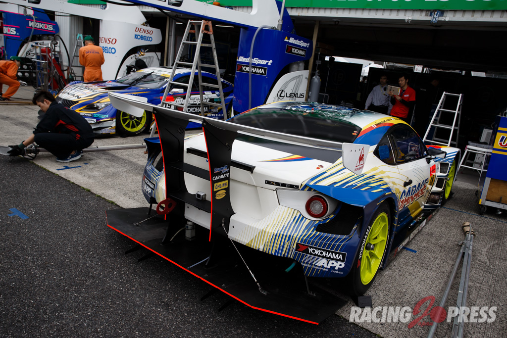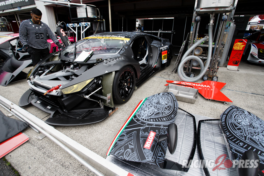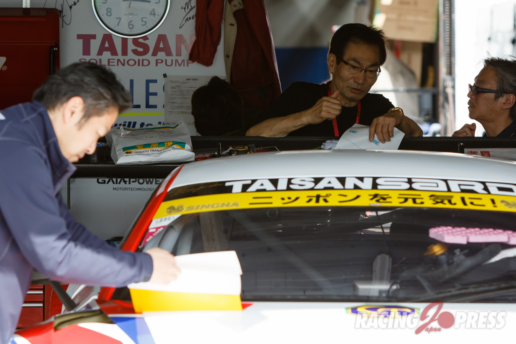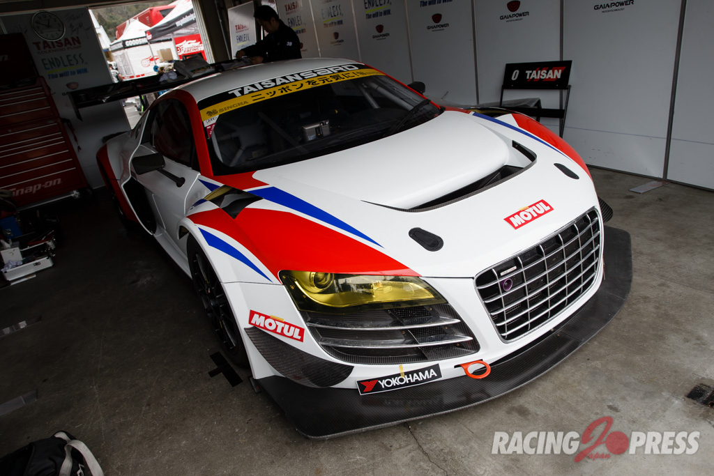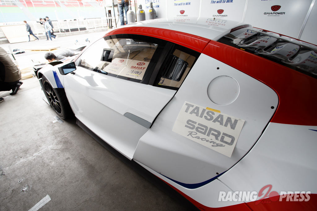 木曜日に届いたばかりというTeam TAISAN SARDの#26 AUDI R8 LMSは現場でカラーリング作業を施し、千葉代表みずからステッカーを貼るシーンも見られた。