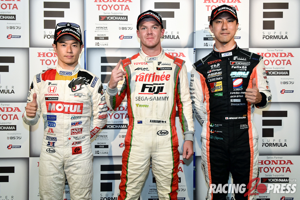 - 左から、予選2番手 #16 山本 尚貴 [TEAM MUGEN SF14] ポールポジション #3 ニック・キャシディ [ORIENTALBIO KONDO SF14] 予選3番手 #1 石浦 宏明 [JMS P.MU/CERUMO・INGING SF14]