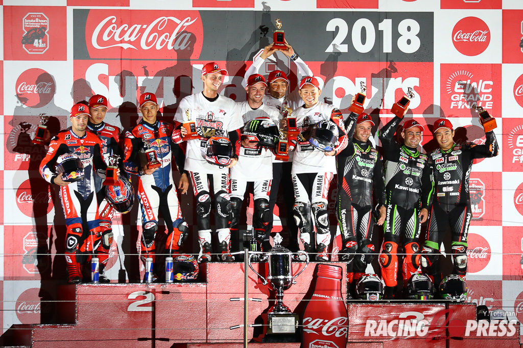 7月29日、鈴鹿サーキットで2017-2018 FIM世界耐久選手権の最終戦となる“コカ・コーラ”鈴鹿8時間耐久ロードレース第41回大会の決勝行われ、 台風12号の影響でめまぐるしく天候が変わるコンディションの中、#21 YAMAHA FACTORY RACING TEAM(中須賀克行/アレックス・ロウズ/マイケル・ファン・デル・マーク)が優勝し鈴鹿8耐4連覇を達成した。2位には#33 Red Bull Honda with 日本郵便(高橋巧/中上貴晶/パトリック・ジェイコブセン)、3位には#11 Kawasaki Team Green(渡辺一馬/ジョナサン・レイ/レオン・ハスラム)が入った。