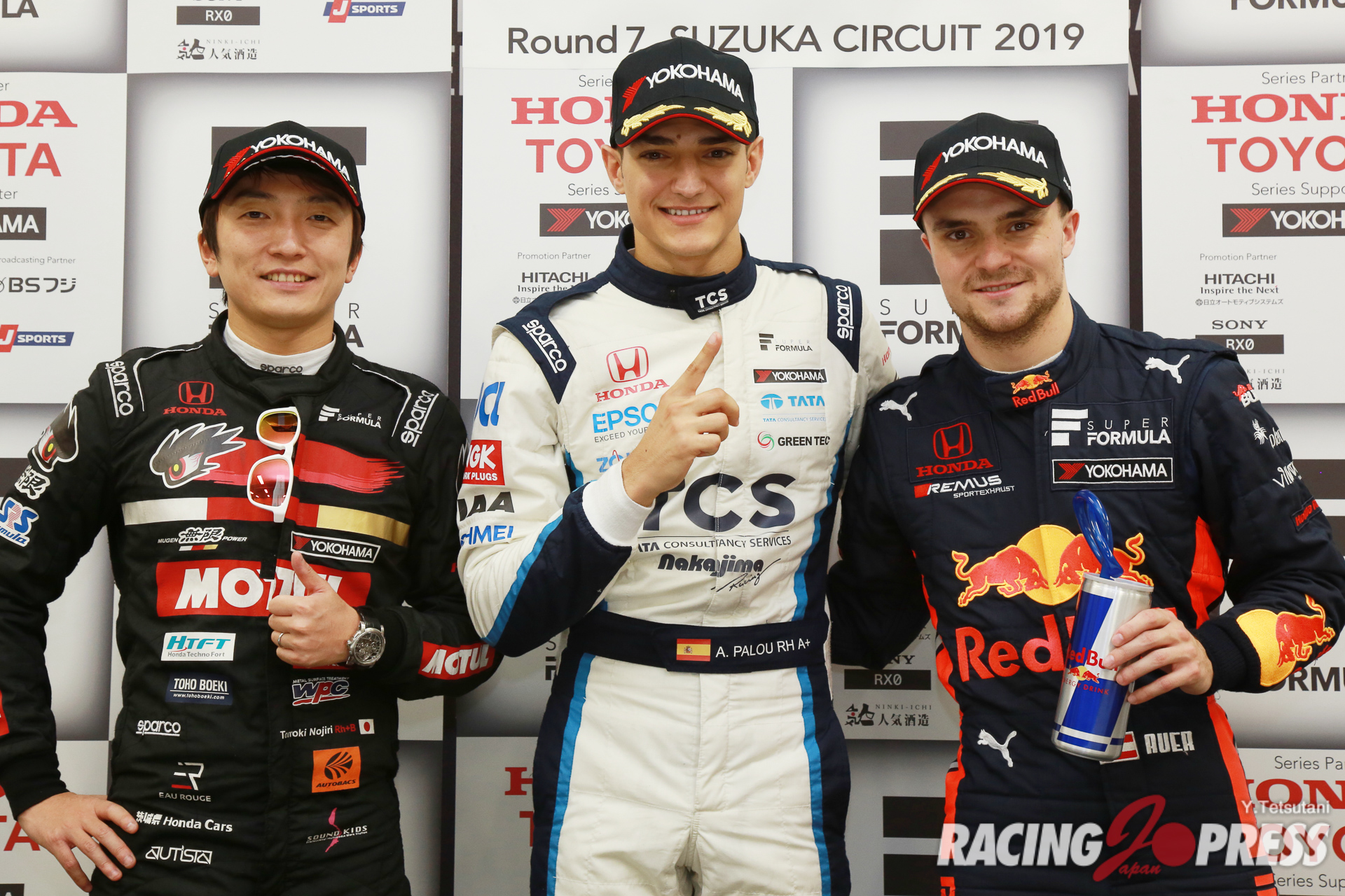 - 左から、予選2番手 #16 野尻 智紀 [TEAM MUGEN SF19] 予選ポールポジション #64 アレックス・パロウ [TCS NAKAJIMA RACING SF19] 予選3番手 #50 ルーカス・アウアー [Red Bull SF19]