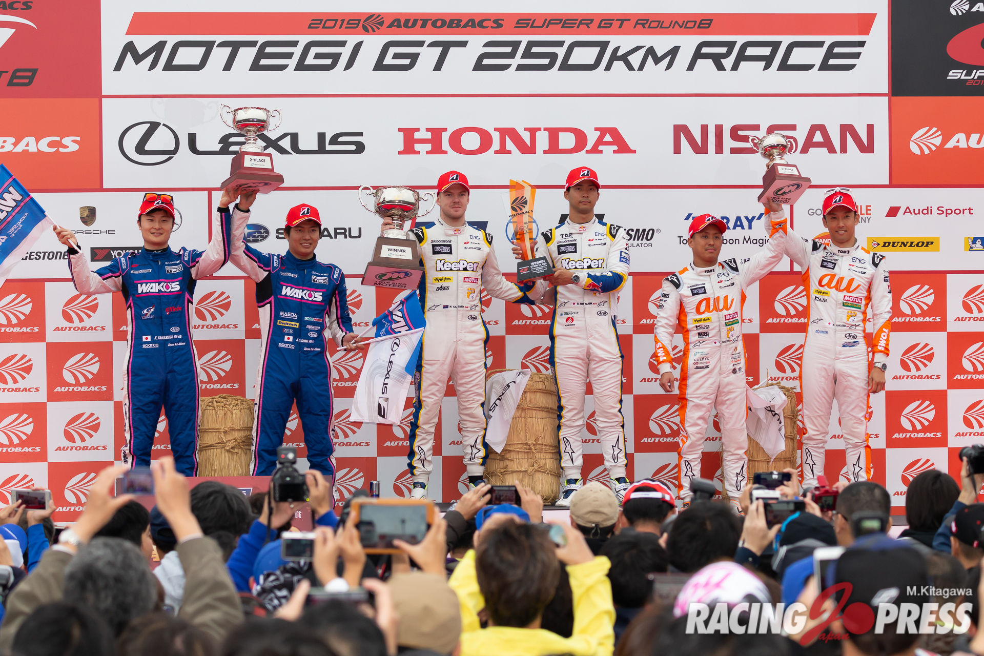11月3日(日)、栃木県のツインリンクもてぎで2019 AUTOBACS SUPER GTのシリーズ最終戦となる第8戦『MOTEGI GT 250km RACE』の決勝が行われ、GT500クラスは4番グリッドからスタートした#37 KeePer TOM’S LC500(平川 亮/ニック・キャシディ)が優勝。チームランキングのタイトルを獲得。2位に入った#6 WAKO’S 4CR LC500(大嶋 和也/山下 健太)がドライバーランキングのタイトルに輝いた。ポールポジションからスタートした#36 au TOM’S LC500(中嶋 一貴/関口 雄飛)は#37 KeePer TOM’S LC500の援護に回り3位となり、レクサス勢が表彰台を独占した。