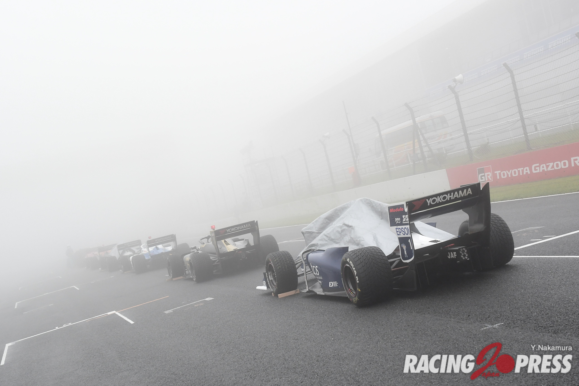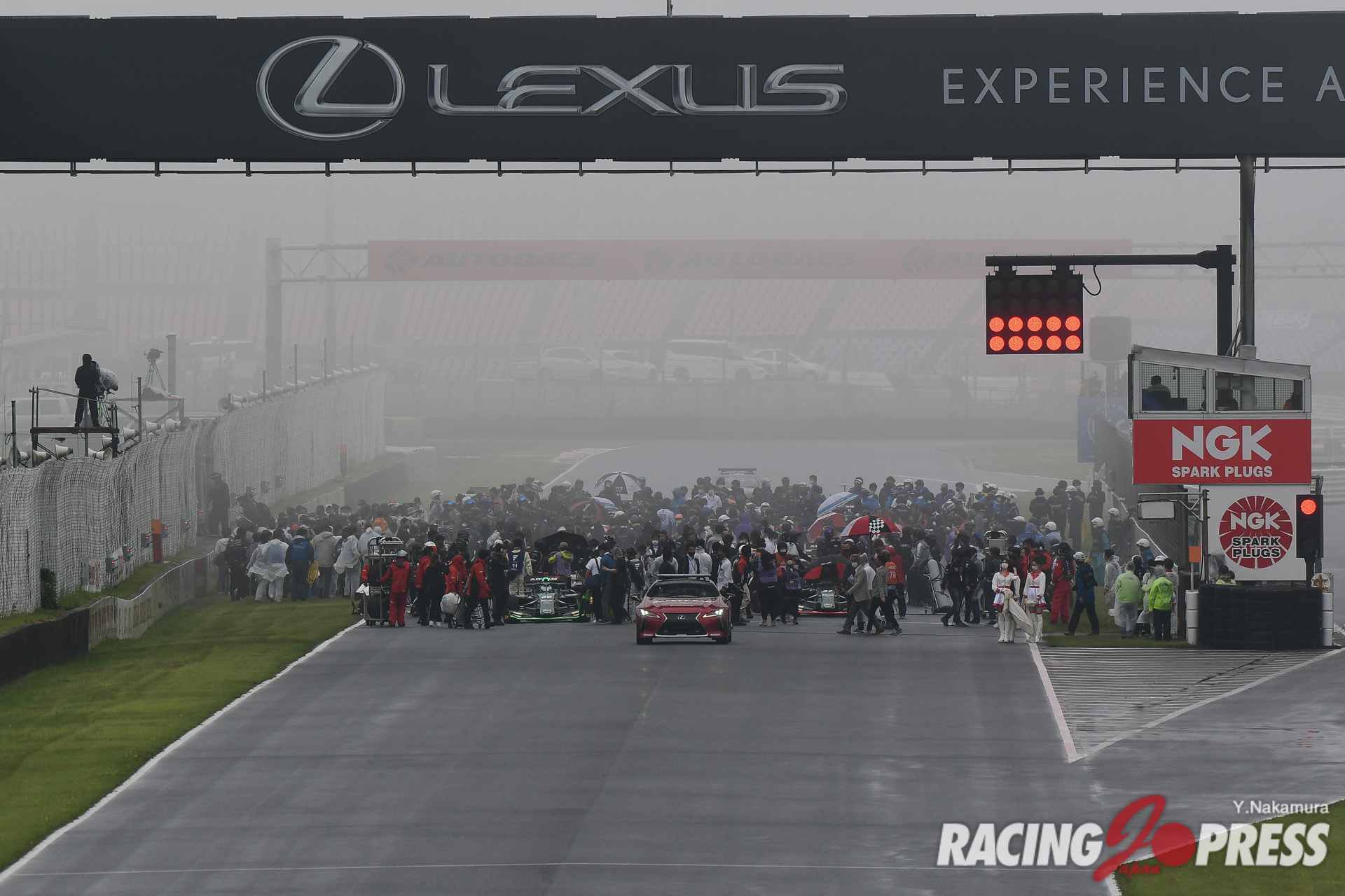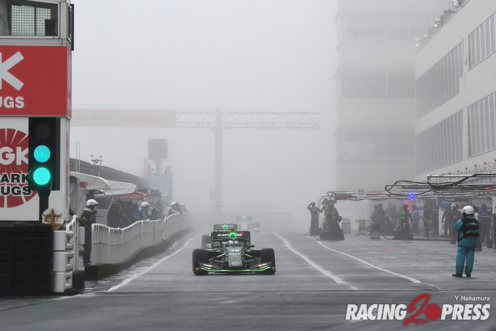 翌日の決勝も朝から濃霧がサーキットをすっぽり包み込んだ。加えて台風のような強風が吹き続けるなど、極めて厳しいコンディションになる。安全面を優先し、サポートレースでは周回数の減算やレースそのものがキャンセルされるなど、スケジュールは大幅に変更。スーパーフォーミュラでは、もともと午前中に30分のフリー走行を予定していたが、これを取りやめて決勝前に20分間のウォームアップ走行が設けられた。