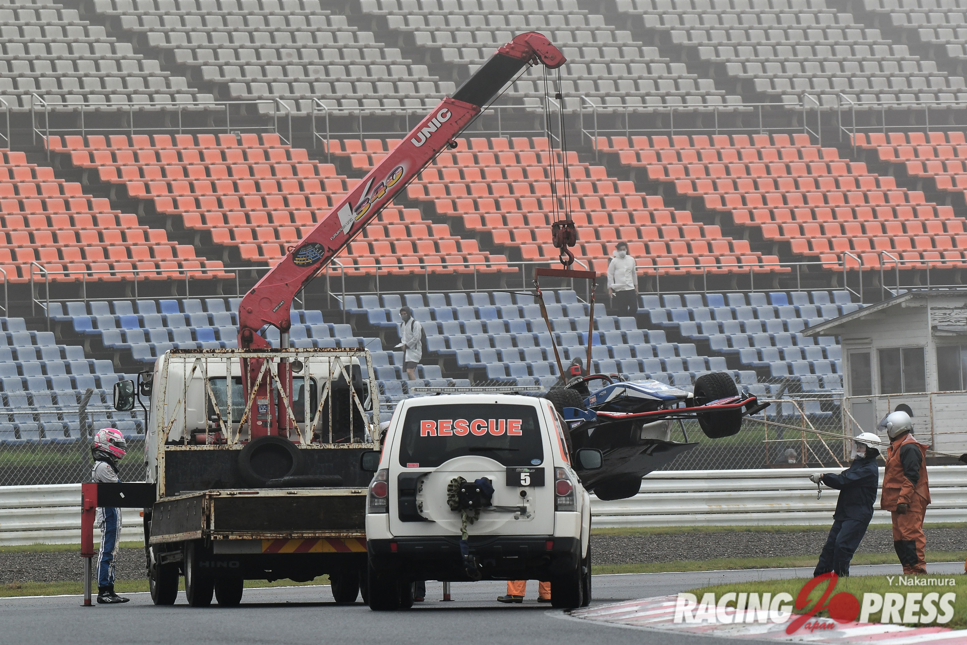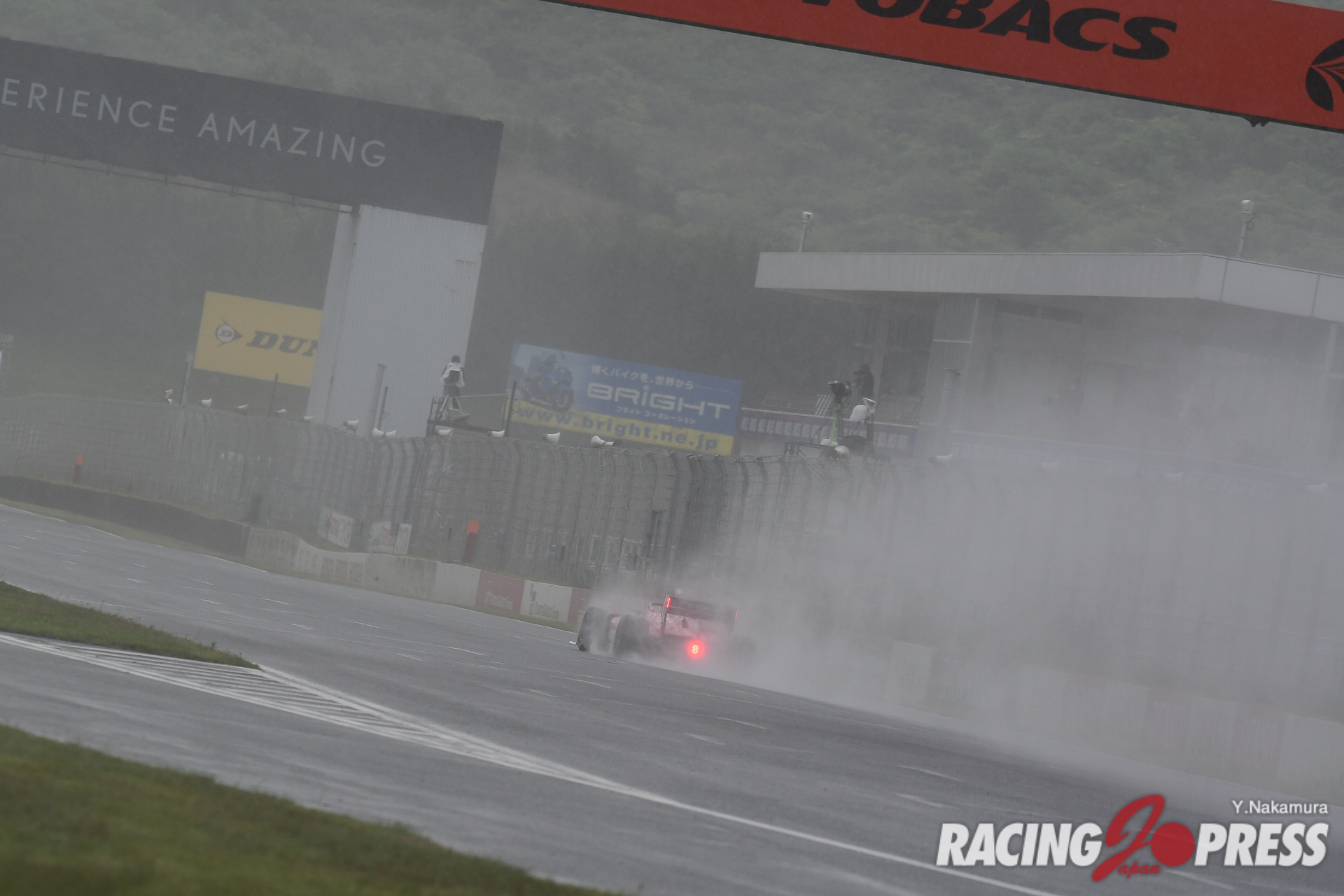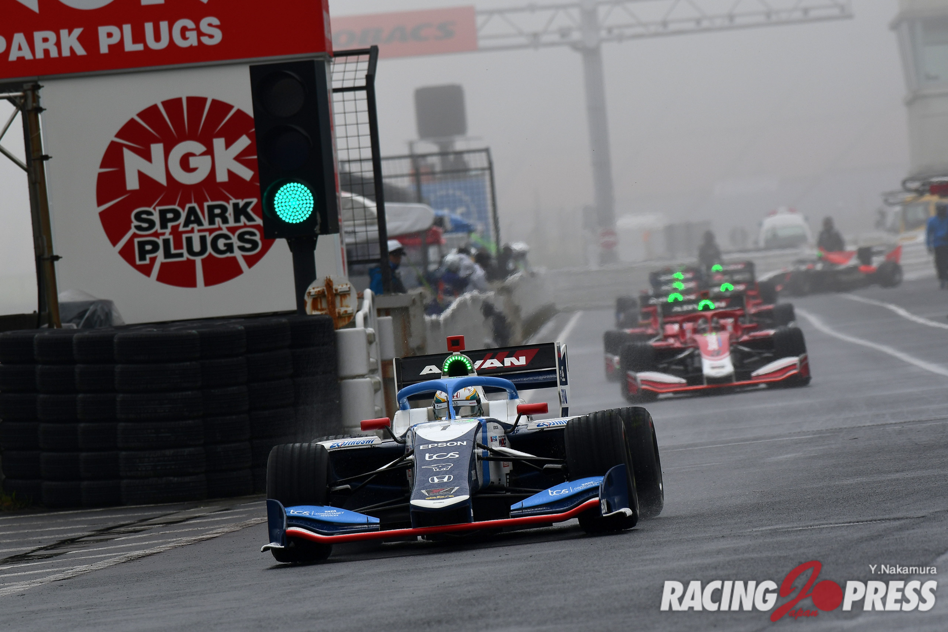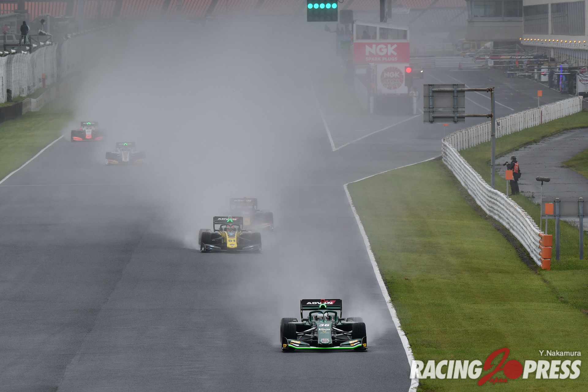 翌日の決勝も朝から濃霧がサーキットをすっぽり包み込んだ。加えて台風のような強風が吹き続けるなど、極めて厳しいコンディションになる。安全面を優先し、サポートレースでは周回数の減算やレースそのものがキャンセルされるなど、スケジュールは大幅に変更。スーパーフォーミュラでは、もともと午前中に30分のフリー走行を予定していたが、これを取りやめて決勝前に20分間のウォームアップ走行が設けられた。