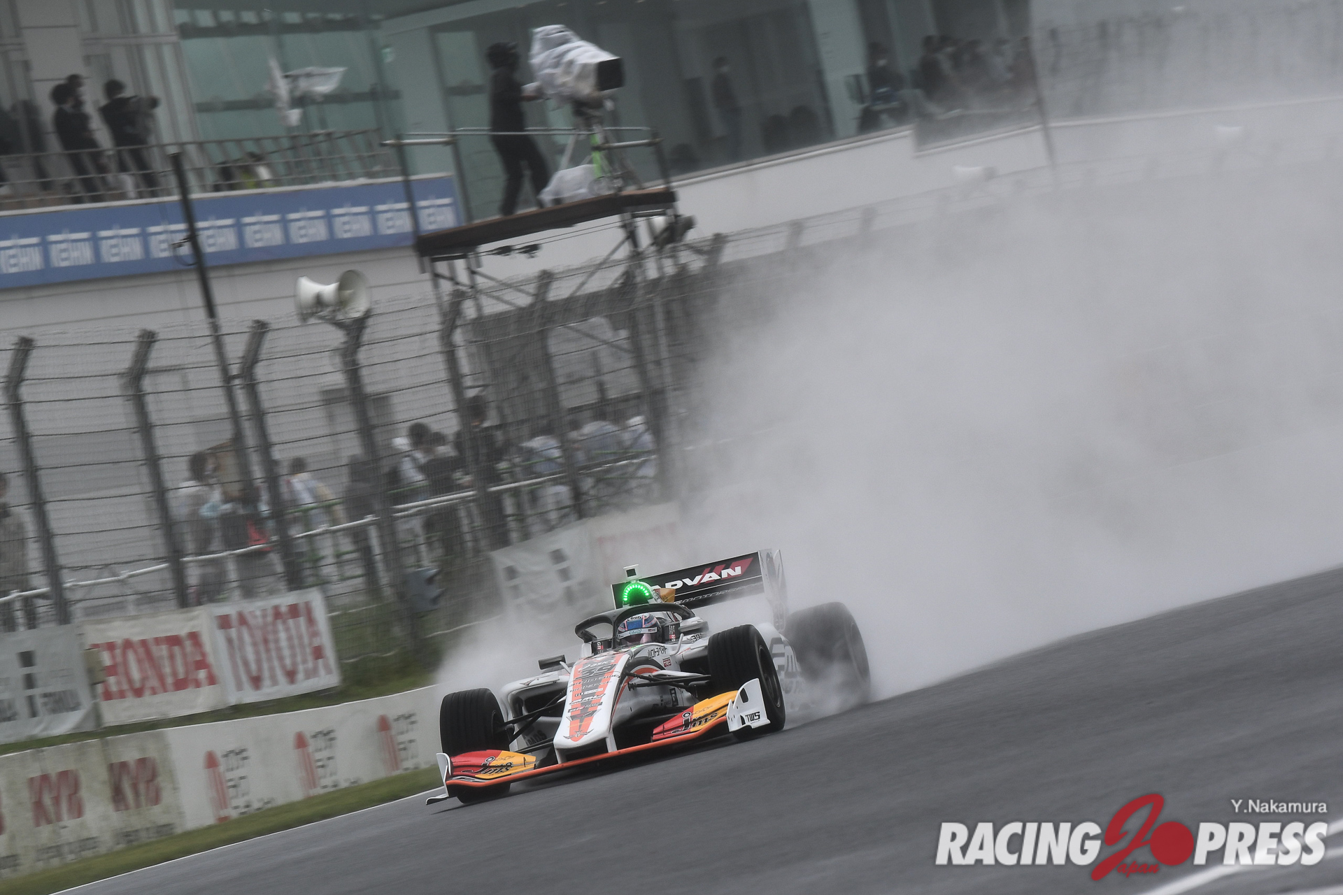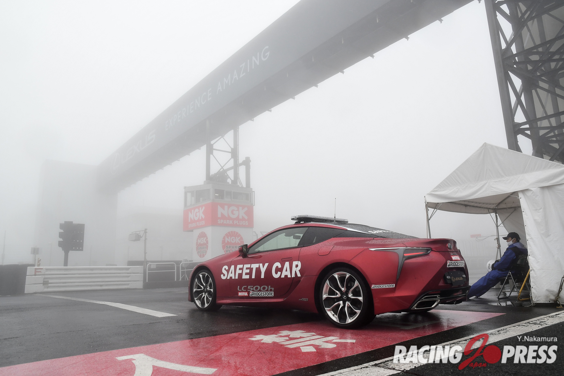 サーキットは雨に加え、濃霧が立ち込める悪天候。午前の時点で今回の予選は通常のノックアウト方式ではなく、40分間の計時方式で進めることが発表されている。そんな中、朝のフリー走行ではコースを飛び出すクルマも多く、午後からの予選もその流れが続いた。加えてセッションスタートもサポートイベントのスケジュール遅れを受け、当初の予定より45分遅れでスタート。各車、コースインするや前方車両の水煙を浴び、十分な視界確保もままならないような状況でアタックを行うことになる。一方、ピットロード出口にほど近いチームは、セッション開始とともにコースインするや、ライバルよりも良好な視界を得てタイミング良くアタックを開始した。