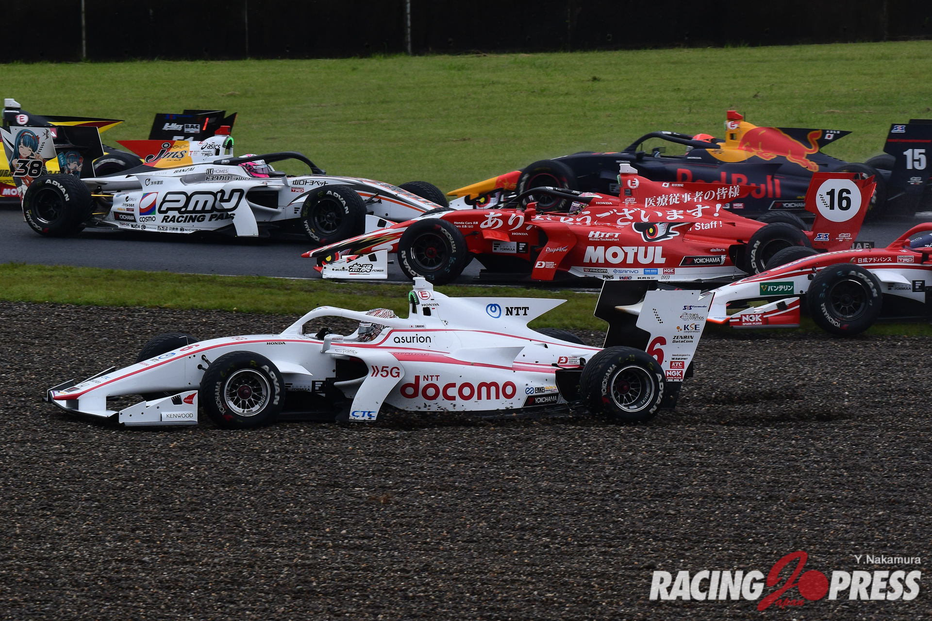 ポールスタートのアレジはクリアスタートを決めたが、2番手宮田はホイルスピンを喫し、ポジションダウン。2番手は関口が取って代わった。その中で、予選5位以降の中断グループが1コーナーで接触。さらに行き場を失った後方車両もその混乱に巻き込まれる。だが、そのハプニングを逆手に取った予選13番手の#51 松下信治(B-MAX RACING TEAM)が3番手へ、さらに11番手の#15 大津弘樹(Red Bull MUGEN Team Goh)も4番手へと大きくジャンプアップした。一方、1コーナーの混乱を受け、コース上にはセーフティカー(SC)が導入されてレースはコントロール下におかれる。SCは4周終了をもって解除されたが、これを見越して加速しはじめていたアレジが挙動を乱し、これを好機と見た関口が急接近。ところが関口がファイナルコーナースタンドで痛恨のスピン。文字通り足元をすくわれ、ポジションダウンを喫した。難を逃れたアレジはその後も逃げの態勢で周回を重ね、2番手には松下、3番手には9周目に大津をかわした阪口が浮上していた。