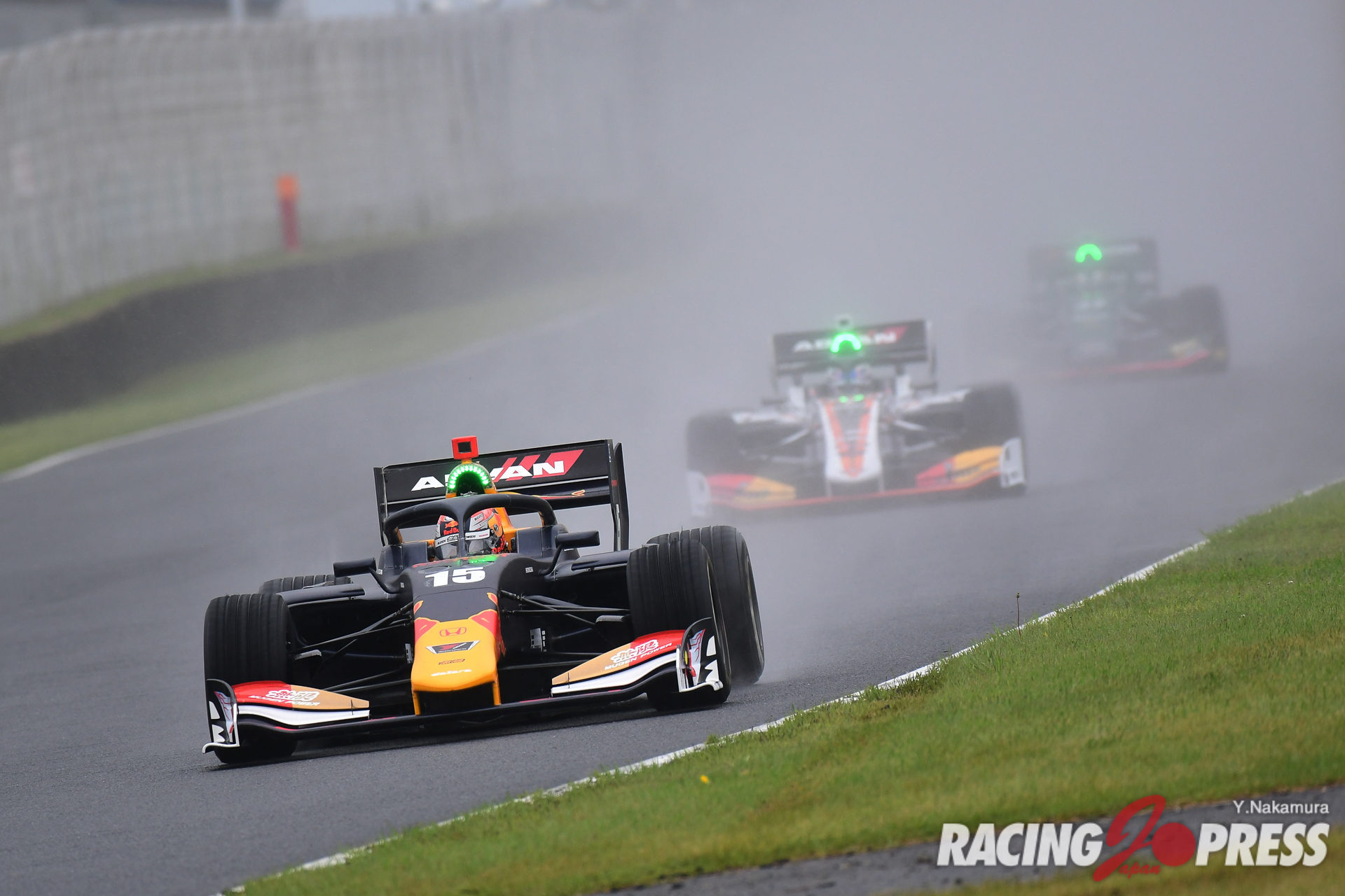 高く上がる水煙の中、コース上には激しく降り続ける雨の影響で川が現れる荒れたコンディションながら、トップ争いはもちろん、各車はそれぞれのポジションで前後のポジション争いを展開。オーバーテイクシステムを巧みに生かし、攻防戦を繰り広げていた。しかし、11周目に入るとさらに天候が悪化。コースを叩きつけるような大粒の雨が落ち始める。これを受け、SCが再びコースイン。スピードを落として車両を先導して周回を重ねたが、安全を最優先するために13周走行中に赤旗が提示され、レースが中断する。