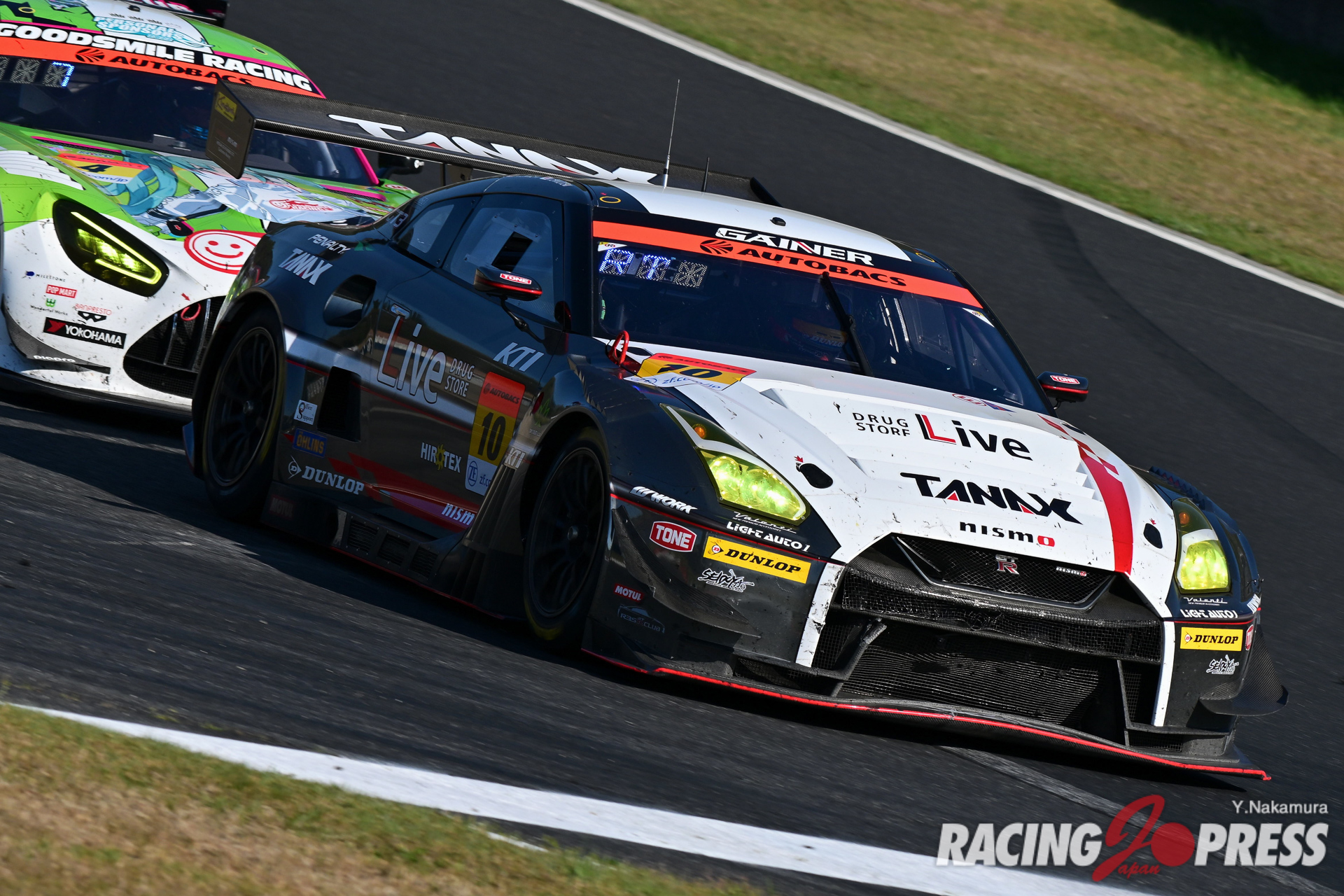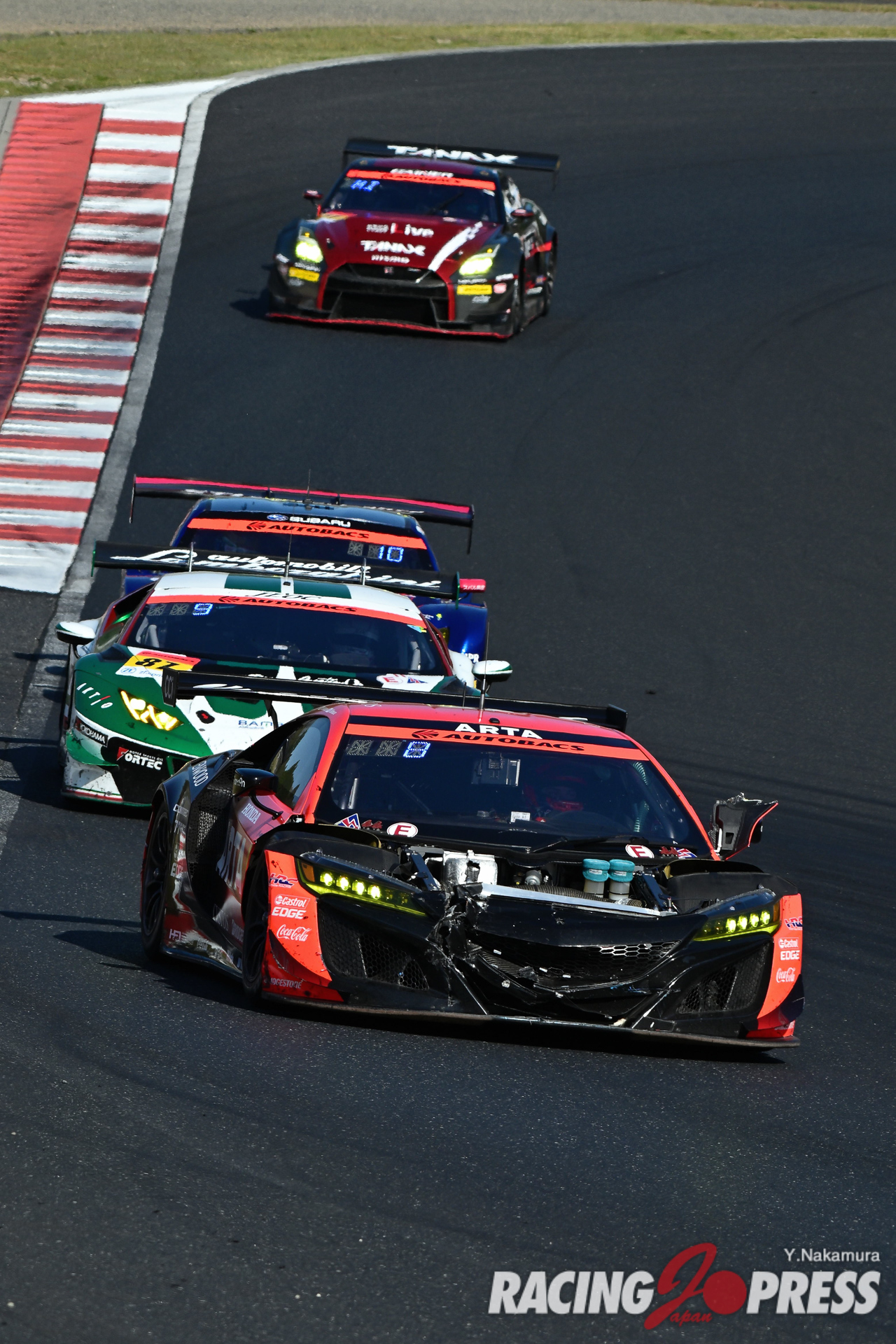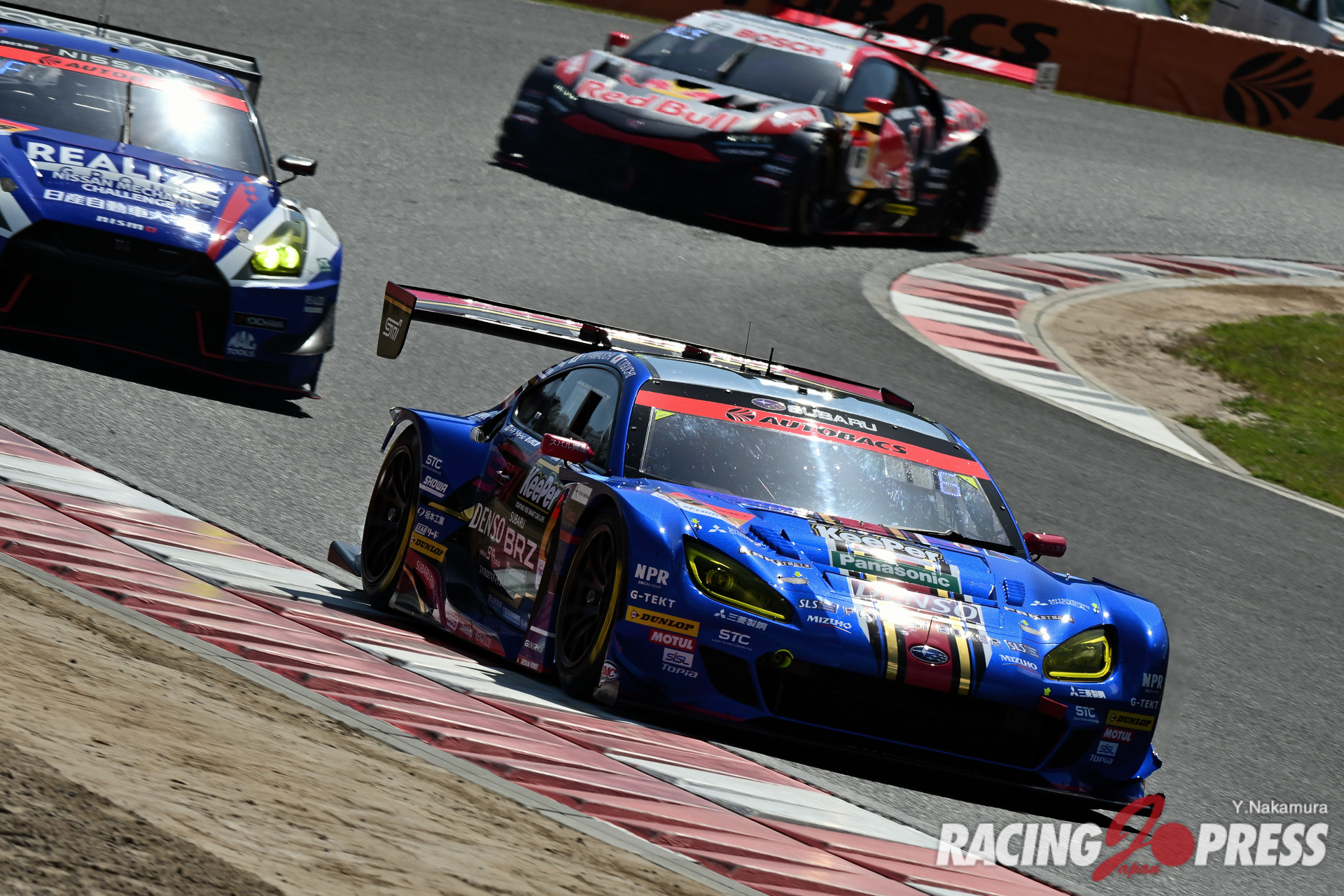 GT500同様、GT300においても昨年の開幕戦を制したチームが強さを発揮、表彰台の真ん中に立っている。レースでの強さを遺憾なく発揮したのは、#56 リアライズ 日産メカニックチャレンジ GT-R(藤波清斗/ジョアオ・パオロ・デ・オリベイラ組)。予選は5番手にとどまったが、レースが始まると着実にポジションアップし、レース開始から40分も経たないうちに#61 SUBARU BRZ R&D SPORT(井口卓人/山内英輝組)からトップを奪い取った。各車のピット作業が終わる頃には、56号車は独走体制を構築。FCYによるペースコントロールで若干後続との差が縮まるも、最後までトップの座を死守。タイトル奪還に向けて申し分のない結果を残した。2位に続いたのは#18 UPGARAGE NSX GT3(小林崇志/太田格之進組)。3位には#65 LEON PYRAMID AMG(蒲生尚弥/篠原拓朗組)が入り、GT500に比べても激しくポジションを入れ替えての戦いになった。