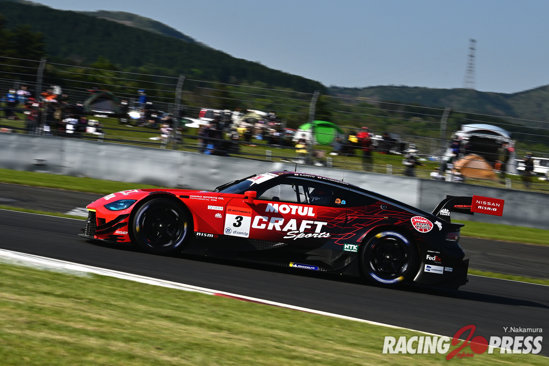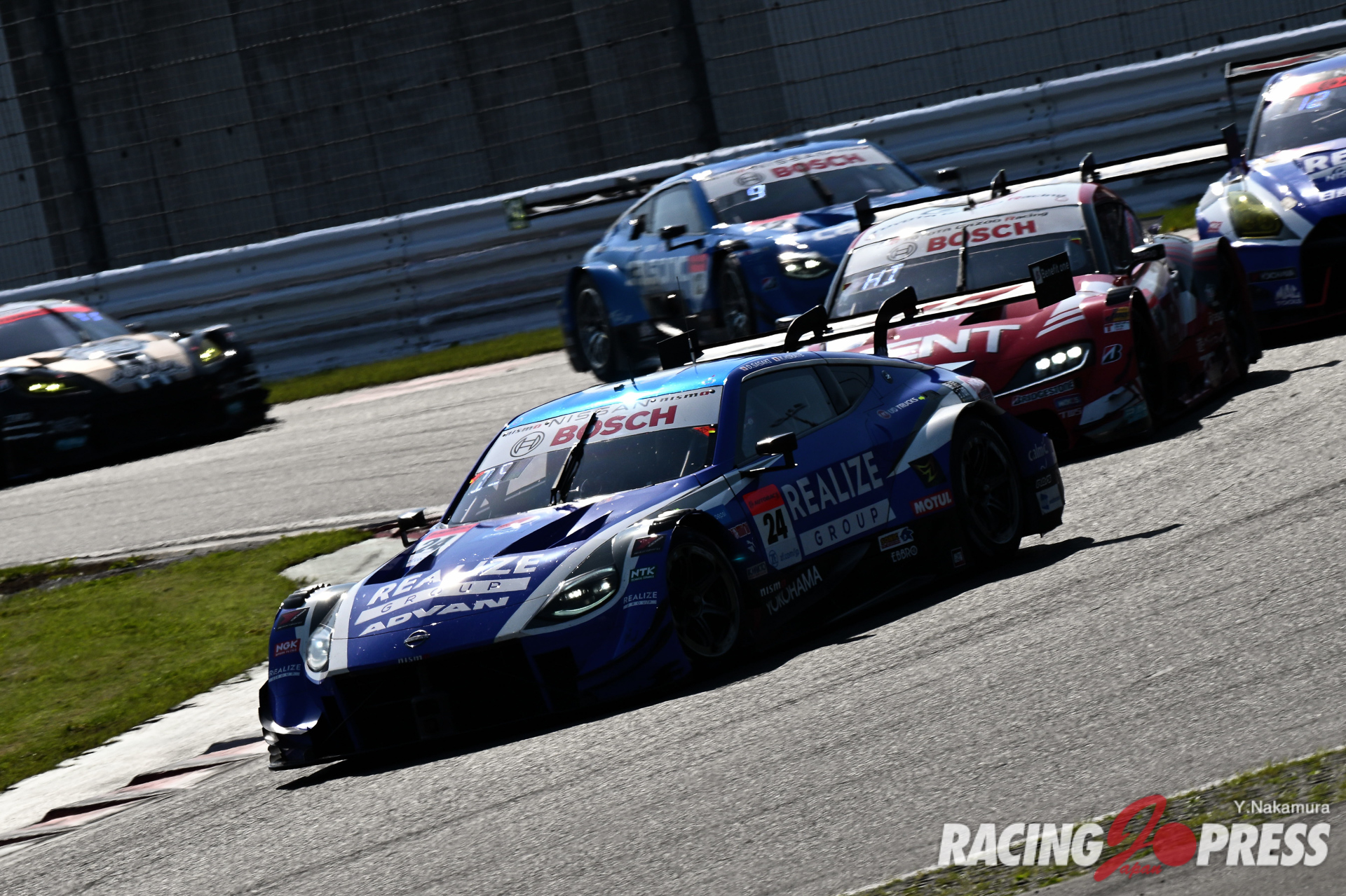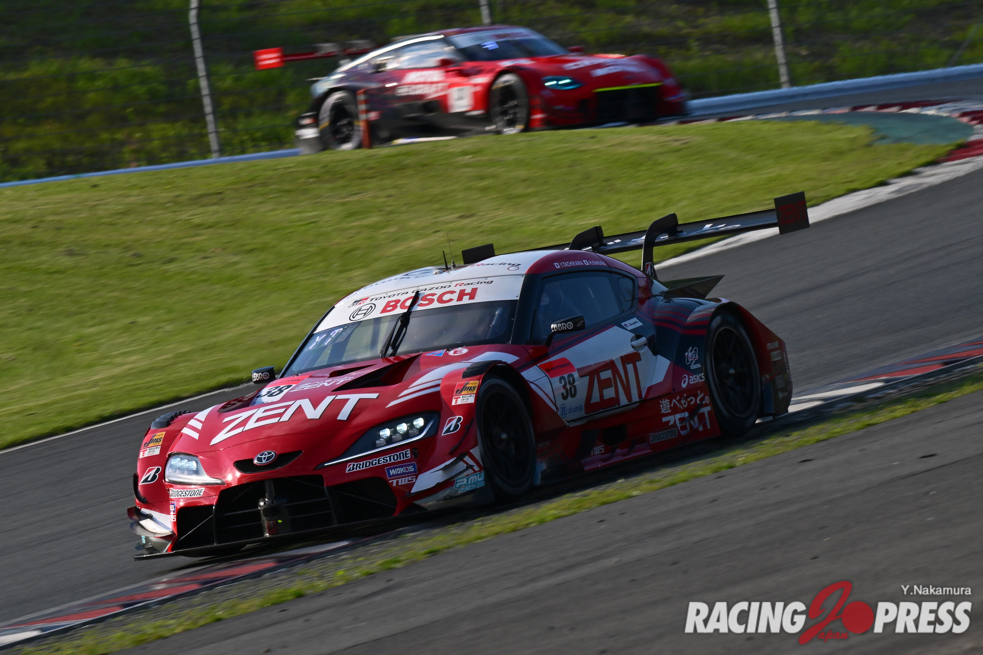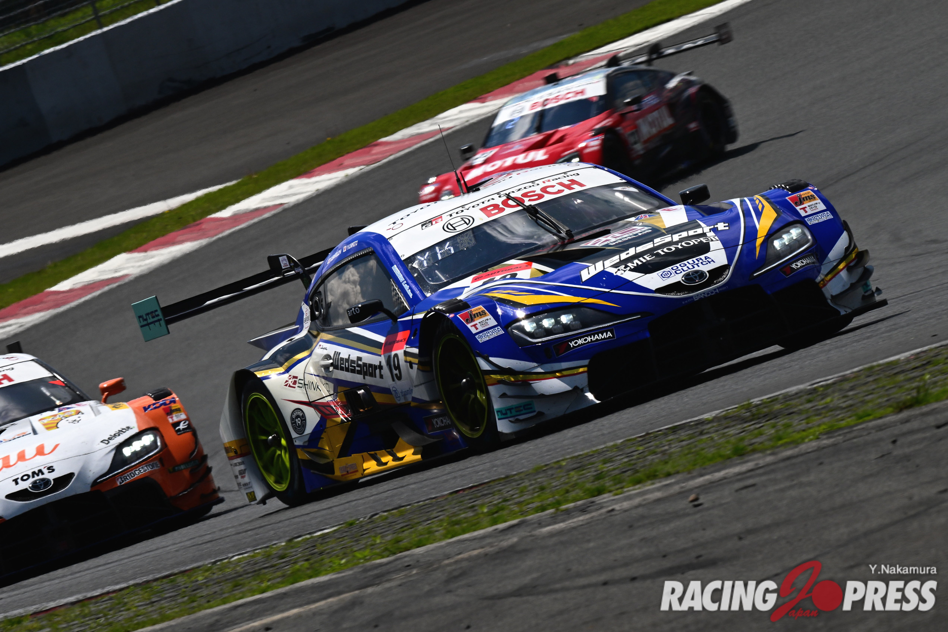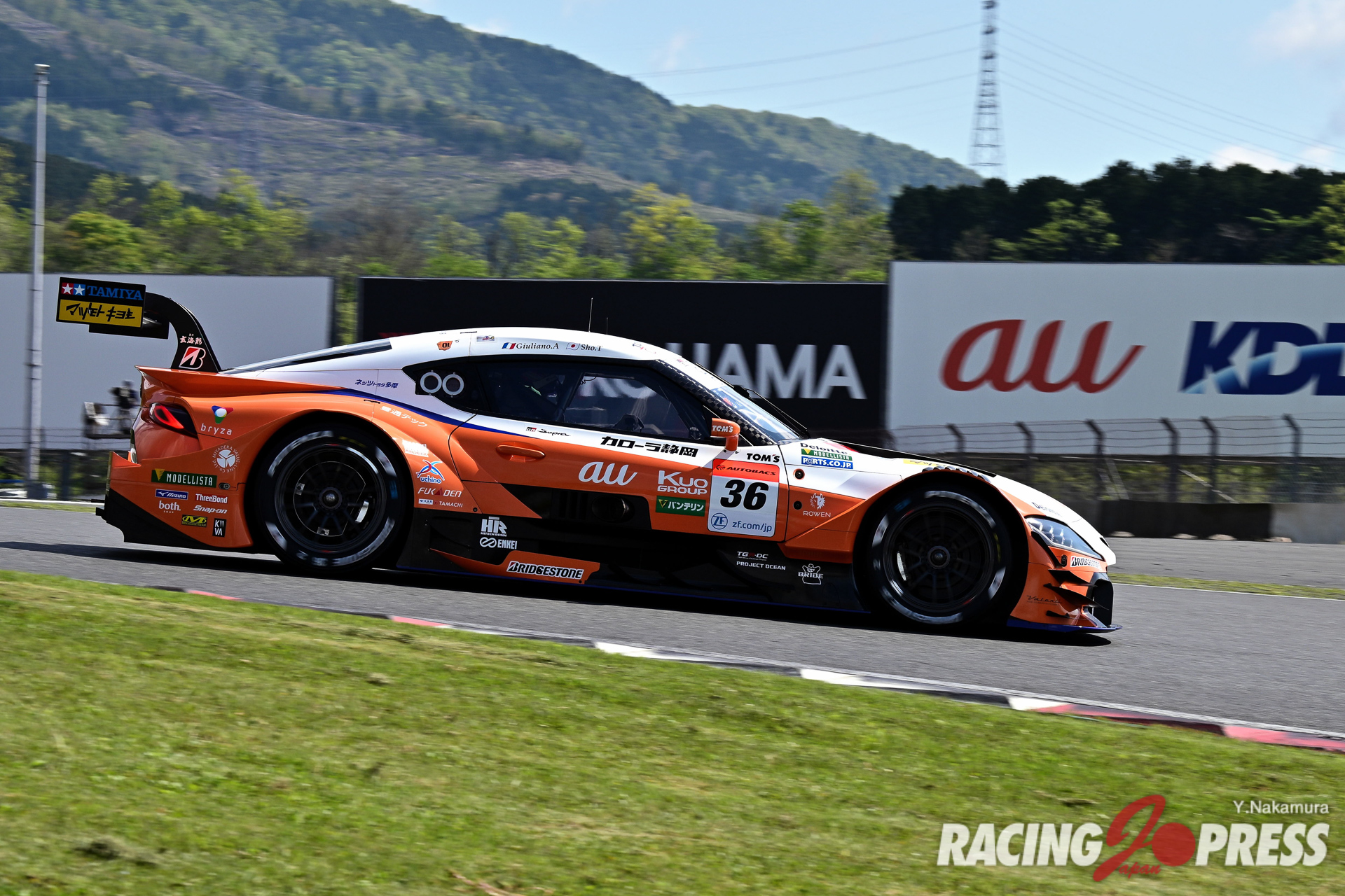 予選日よりもさらに天候がよくなった決勝日。強い日差しもあり、決勝前には気温20度、路面温度35度というコンディション。各車が選択したタイヤパフォーマンスにどんな差が現れるのか、気になる幕開けでもあった。そんな中、フロントロウのヨコハマ勢を追いかける他メーカーのウォームアップが優位に立ち、予選4番手の#37 KeePer TOM’S GR Supra(サッシャ・フェネストラズ/宮田莉朋組)が即座にトップを奪取する。これに、#36 au TOM’S GR Supra(坪井 翔/ジュリアーノ・アレジ組)、#3 CRAFTSPORTS MOTUL Z(千代勝正/高星明誠組)が続いたが、その後、36号車は37号車を逆転、トムス勢同士の激しいトップ争いを展開した。