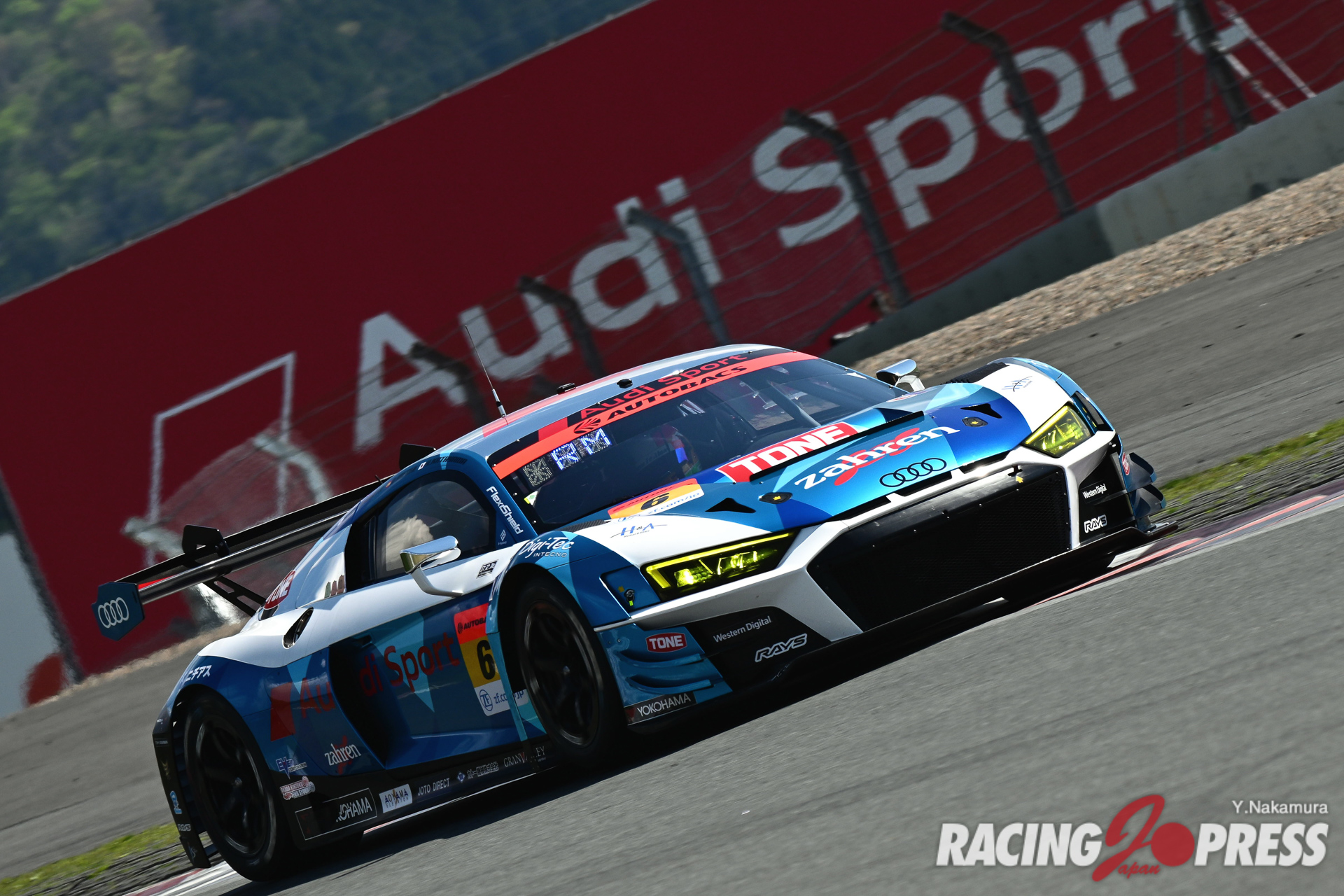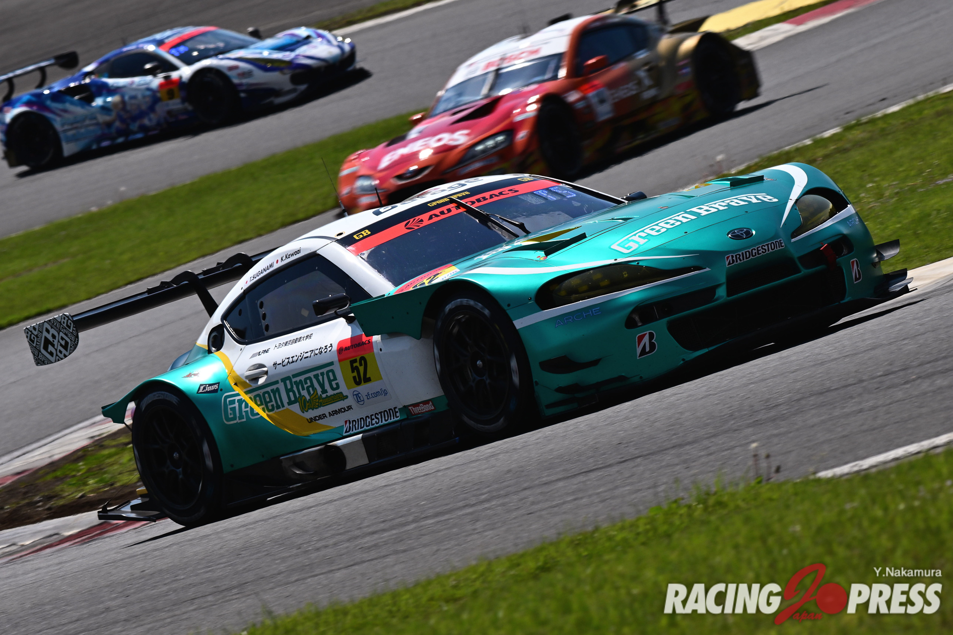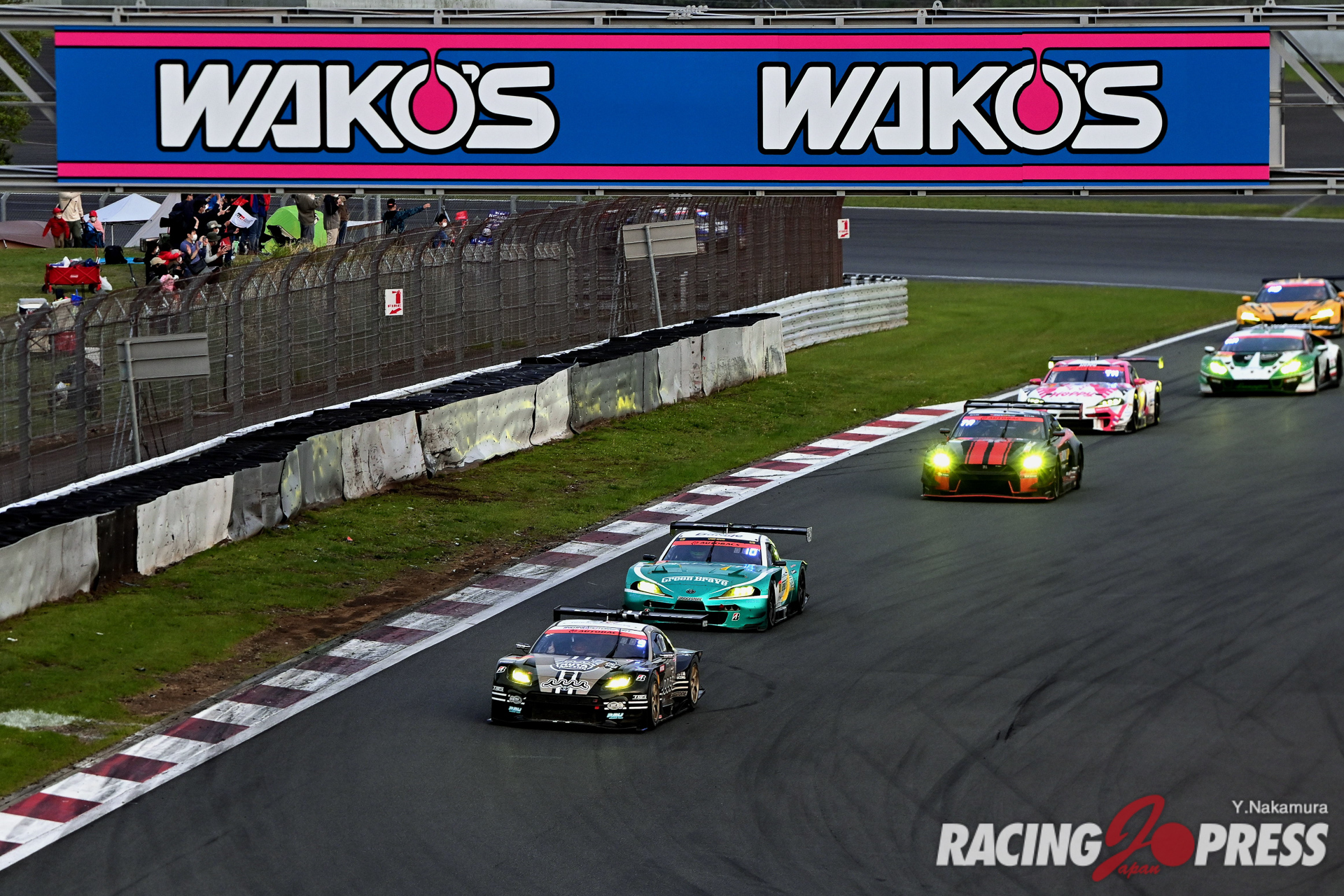 ポールスタートの61号車に対し、スタート直後から猛烈にアタックを見せた10号車。タイヤのウォームアップが異なるのか、コカ・コーラコーナーの立ち上がりでトップを奪取してみせた。その後、10号車と61号車とは付かず離れずの状態となり、逆に3番手争いが激しくなっていく。14周目にはコカ・コーラコーナーで予選3番手の#96 K-tunes RC F GT3(新田守男/高木真一組)が予選4番手の#34 BUSOU raffinee GT-R(柳田真孝/井出有治組)を鮮やかな逆転劇を見せた。