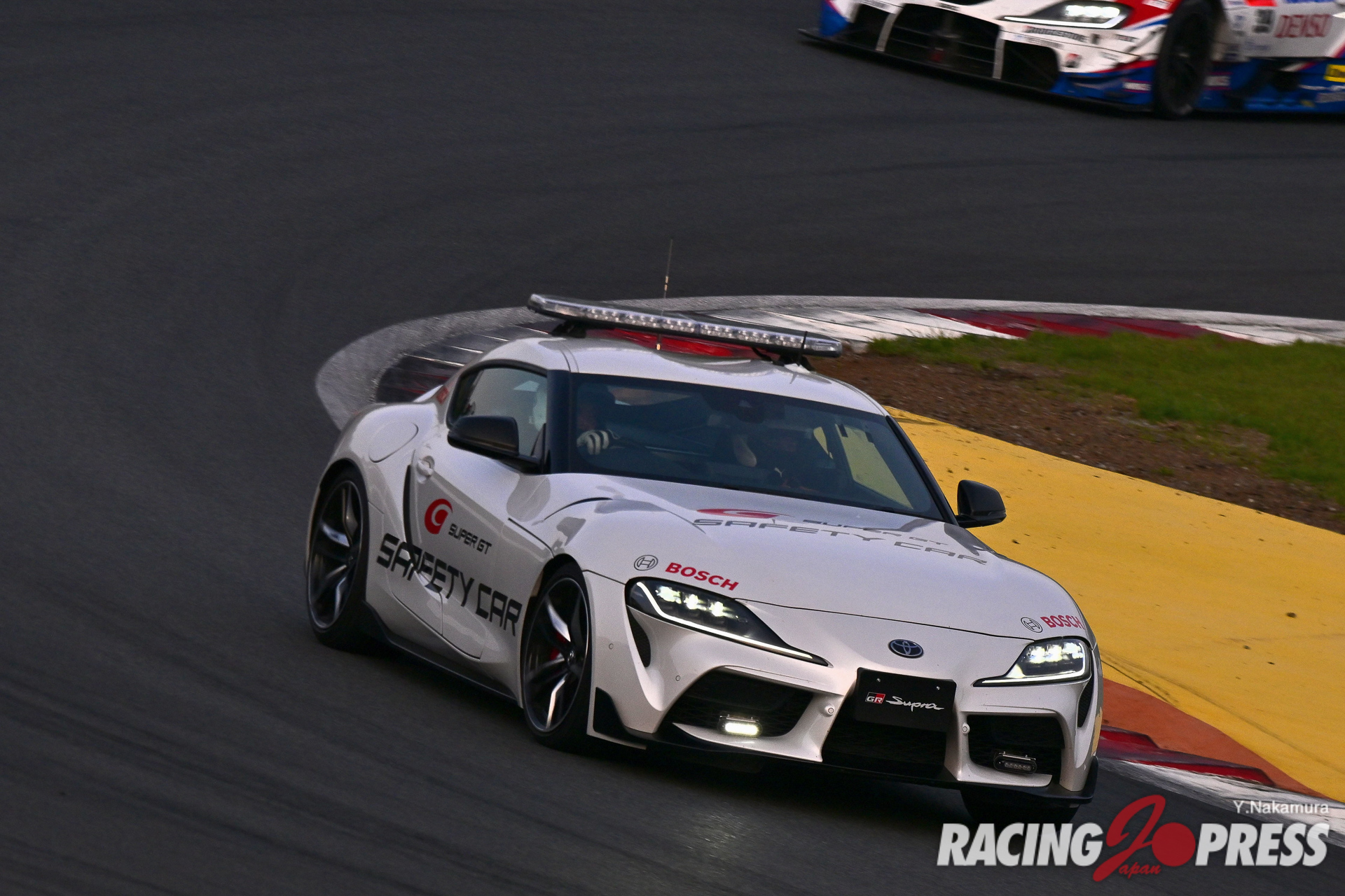 レースは周回距離3分の1を前にルーティンのピットインが始まる。一方、戦略的に1回目のピットインを大幅にずらすチームもあり、最も遅くに敢行したのが#39 DENSO KOBELCO SARD GR Supra(関口雄飛/中山雄一組)だった。すると、ほぼ同じタイミングえGT300の1台がヘアピンで激しくクラッシュ。最初はFCY(フルコースイエロー)が宣言されたが、すぐさまSC(セーフティカー)ランへと切り替わり、ほどなくして48周目に赤旗中断に変わる。これは、ガードレースの損傷が激しく、レースを続行したままでの修理が難しいというのが理由だった。