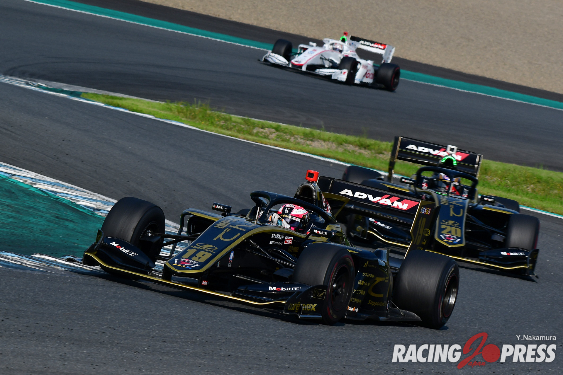 決勝レースも前日同様に午後2時30分にスタート。もてぎは午後に入ると次第に天候が回復。強い夏の眩しい日差しが照りつける暑さが戻ってくる。自身初のポールポジションスタートから申し分のない蹴り出しを見せた大湯がトップでホールショットを奪う一方、もう一人のフロントロウであるフェネストラズは動きが鈍り、予選3番手の野尻が先に1コーナーへ。フェネストラズは自身の後方にいた予選4番手山下にも詰め寄られたが、2コーナーでこれを阻止。なんとか3番手を死守した。その後方では、予選7番手の#19 関口雄飛(carenex TEAM IMPUL)が6番手スタートだった僚友の#20 平川亮も含め、2台を抜いてポジションアップ。だが翌周は平川が90度コーナーで逆転し、ポジションを取り戻した。