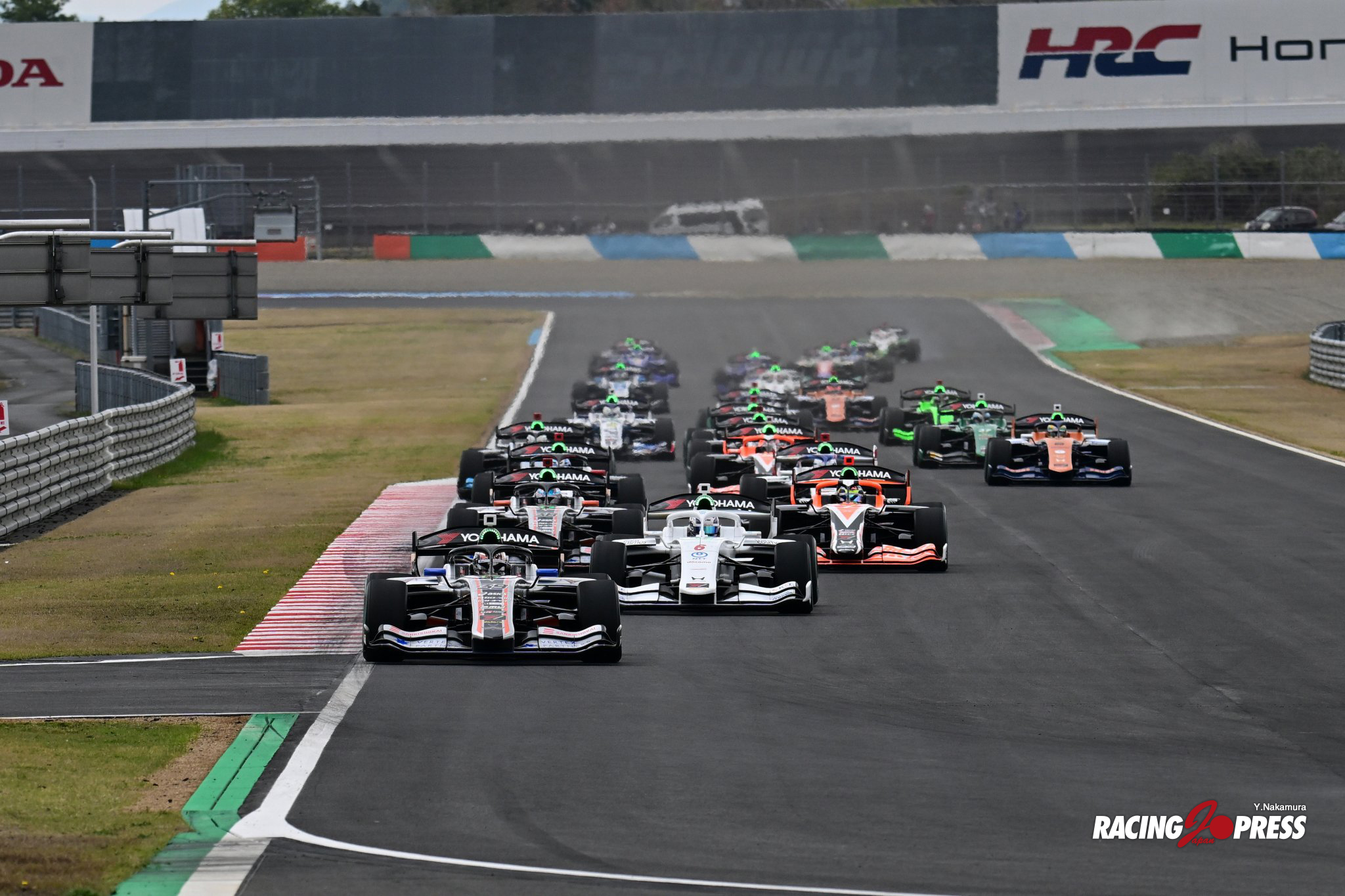 気温13度、路面温度15度と前日とは打って変わっての寒いコンディション。SCに先導されて周回するも3周目には赤旗が提示され、長らく待機が続いた。午後3時55分、ようやくSCランでの再開を迎え、ようやく15周が過ぎてレースモードとなったが、激しいポジション取りのなかで接触が発生。すぐに3回目のSC導入を迎えた。さらには後方でクラッシュも起こり、まさにサバイバルレースへと化していく。