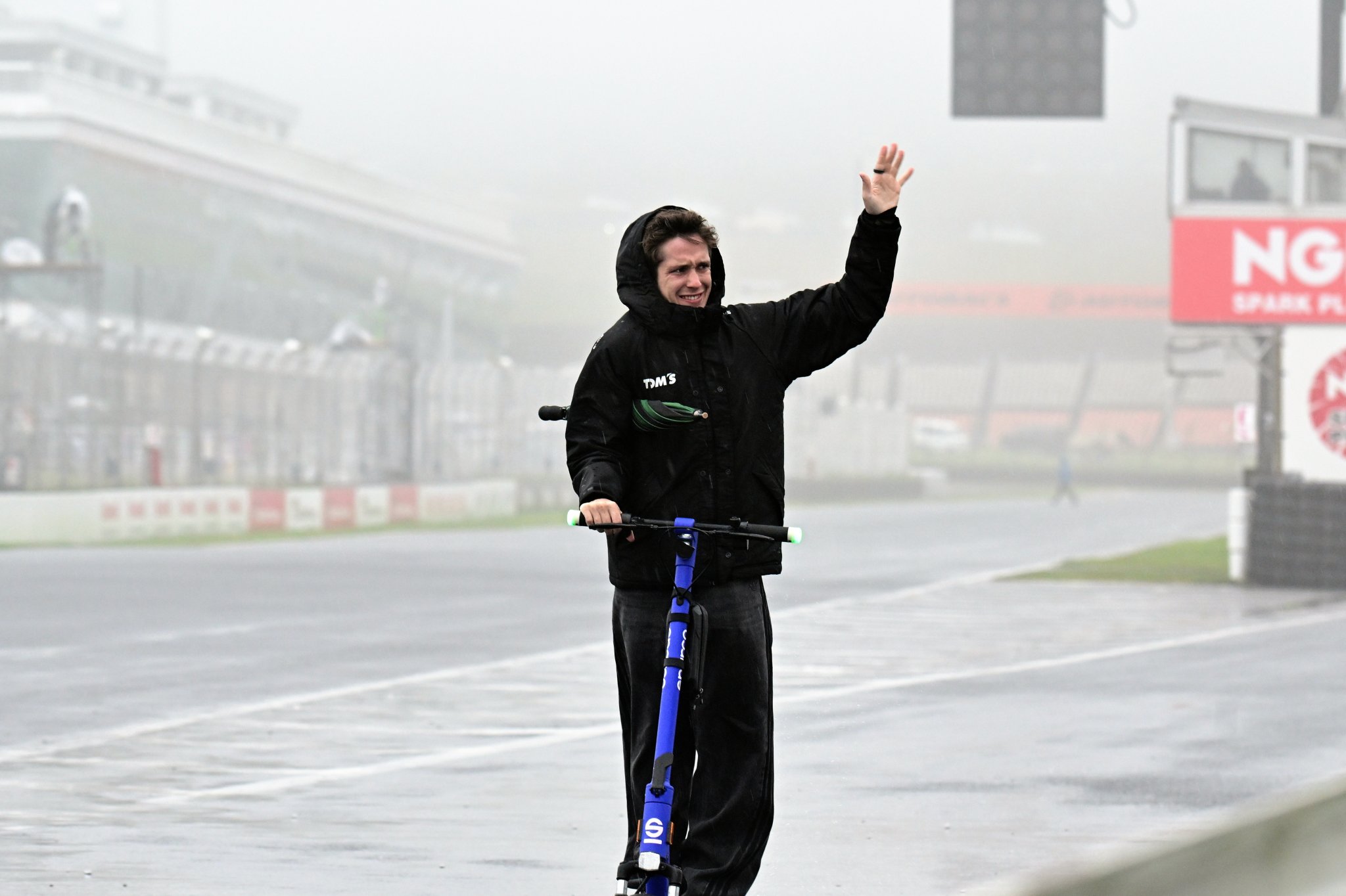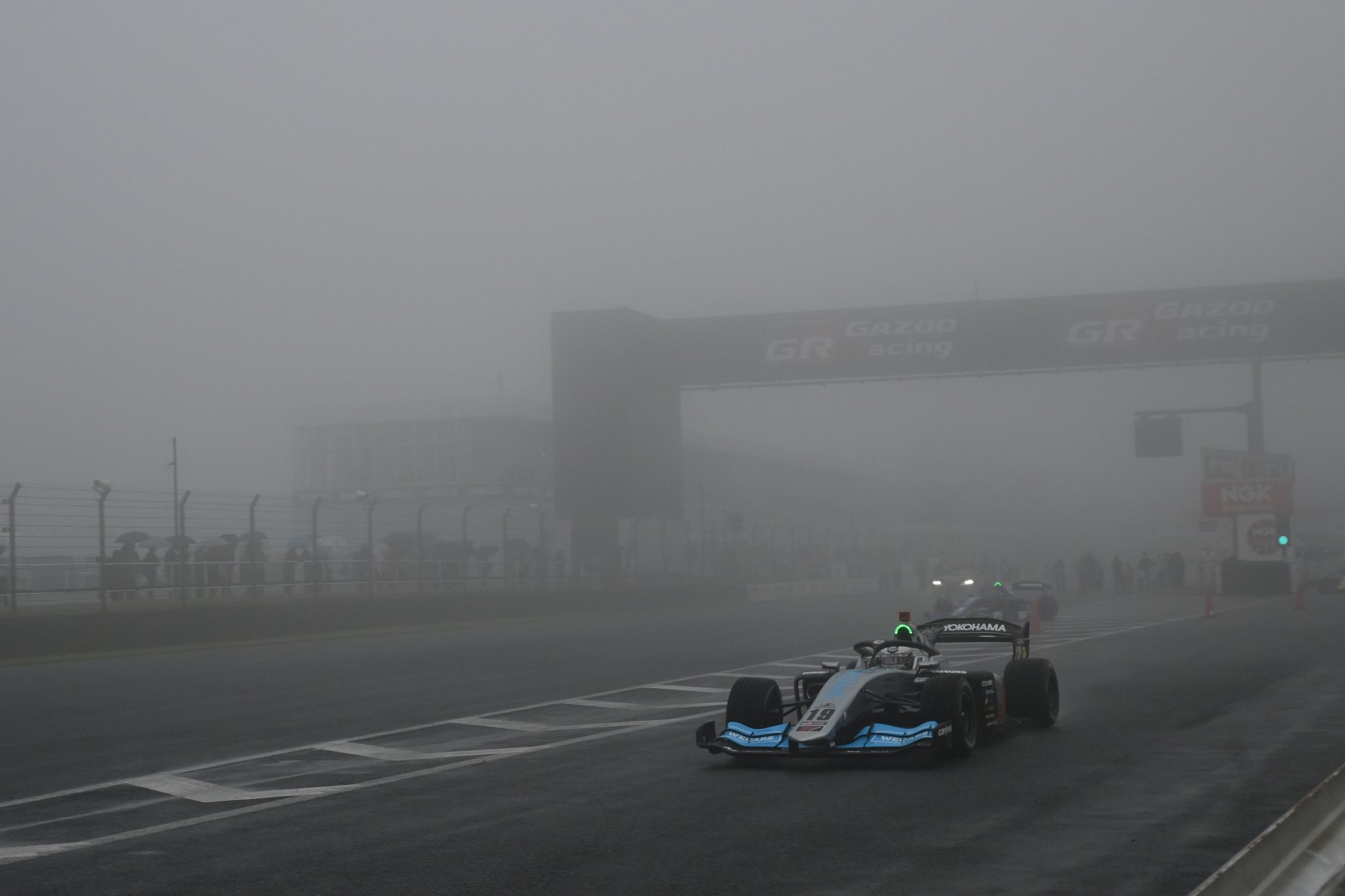決勝日を迎えたオートポリスは朝から雨模様。冷たい風と霧がサーキットを包み込む悪天候に一変した。朝のフリー走行は弱い雨で走行が可能だったが、30分のセッション終盤に1台の車両がコースアウトし、クラッシュ。残り10分ほどの走行を待たずに赤旗終了となった。