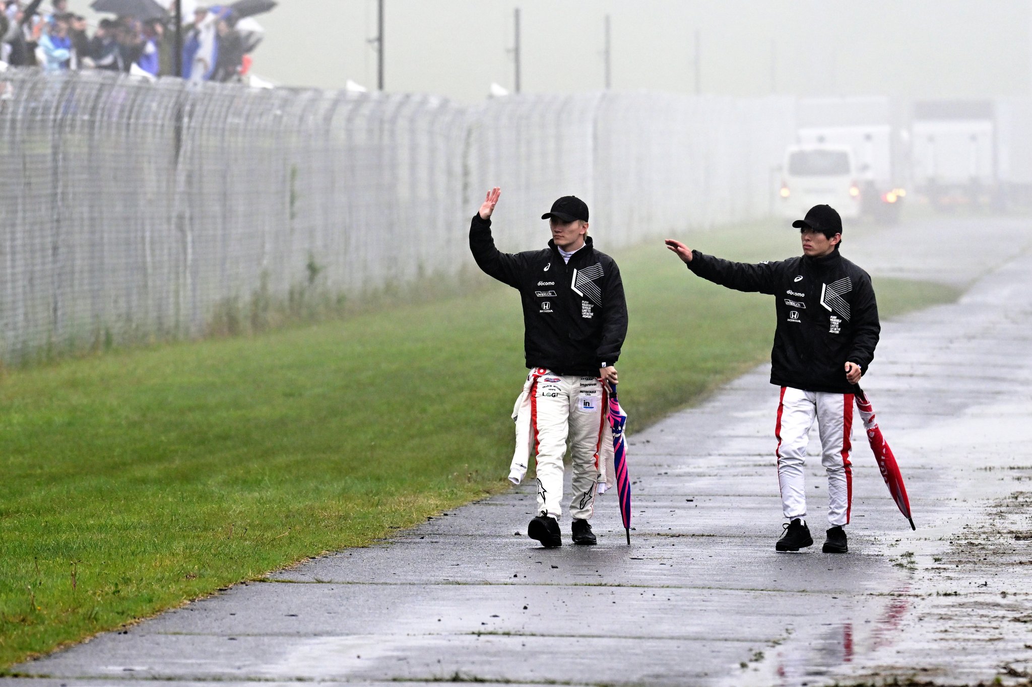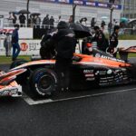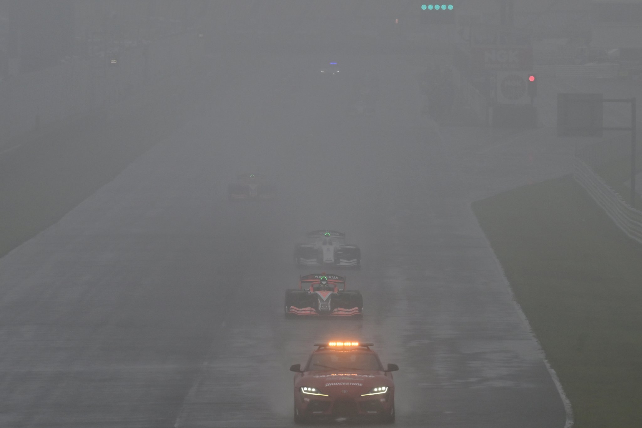 午後に向けて少し雨が収まったかに思われたが、決勝が近づくにつれ徐々に雨が強まってくる。午後2時30分に号砲予定だったスタートはディレイとなり。午後2時48分、セーフティカー先導によるスタートを迎えた。しかし、その走行中にすぐ赤旗が提示され、各車が再びメインストレート上に停止。再開の時間が読めず、ドライバーはみなクルマを離れ、チームピットへと戻った。